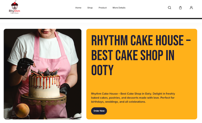 Rhythm Cake House – Best Cake Shop in Ooty. Delight in freshly baked cakes, pastries, and desserts made with love. Perfect for birthdays, weddings, and all celebrations.
